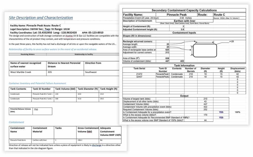 Automate SPCC inspections, berm pass/fail + required height, and export site descriptions + Excel calcs in one click.