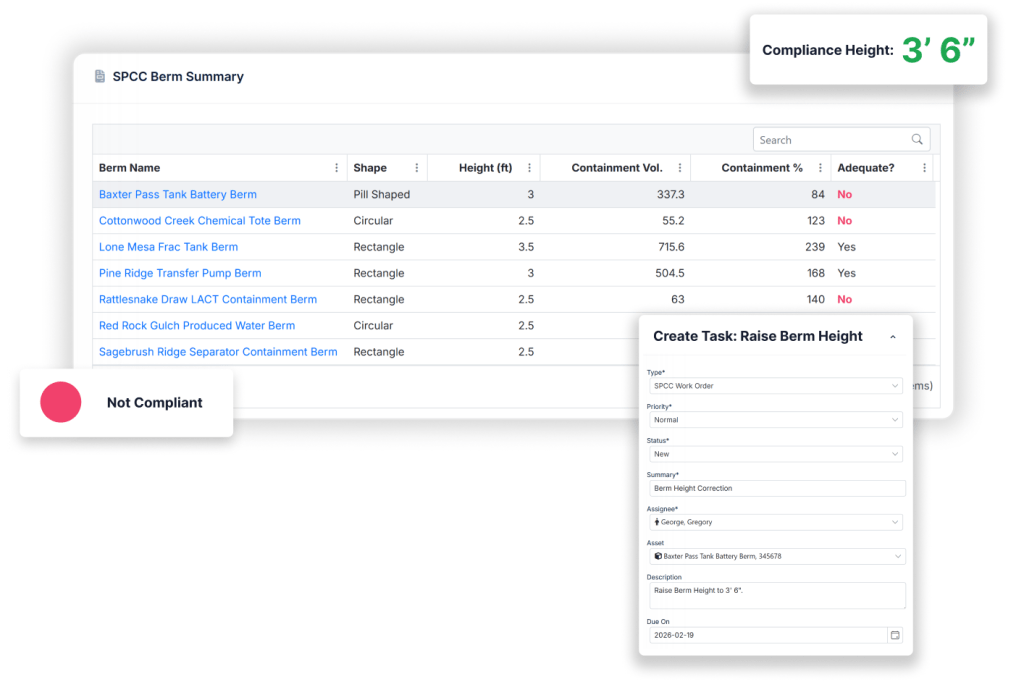 Automatically convert those inputs into auditable results: BMP-based pass/fail, current containment capacity, required capacity, and the exact height/capacity needed to reach compliance. Approve and dispatch berm repair tasks to the field.